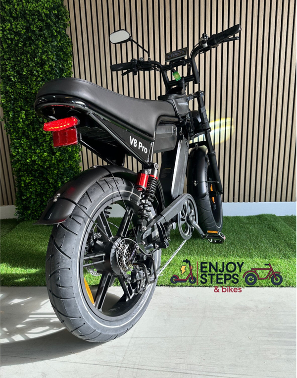 Wat het grootste verschil is met de normale Ouxi V8/C80? Het zit hem in de vorm, de extra batterij, de dubbele achterveing, de handige nfc-chips die nodig zijn voor het aanzetten en de knipperlicht die nu ook in het voorlamp zit. Maar wat als eerste opvalt is natuurlijk vooral de vorm van het frame. De Ouxi V8 Pro fatbike heeft een nog meer uniekere vorm gekregen van een stoere motorfiets maar nu met een langere zadel en hogere stuur, wat zorgt voor meer rijcomfort. Zo beschikt deze Ouxi fatbike ook over een tweede uitneembare accu met een actieradius samen tot wel 80-120 km, welke ook handig is om binnen op te laden en de fiets niet helemaal mee hoeft te sjouwen! Met zijn grote 20 inch straat banden die voor enorm veel grip op de weg zorgen, is deze fatbike onmisbaar voor een avontuurlijke trip. Verder heeft de Ouxi V8 Pro elektrische fatbike ook verschillende snelheidsstanden waaruit je kan kiezen en trekt deze snel en geruisloos op tot 25 km/h.