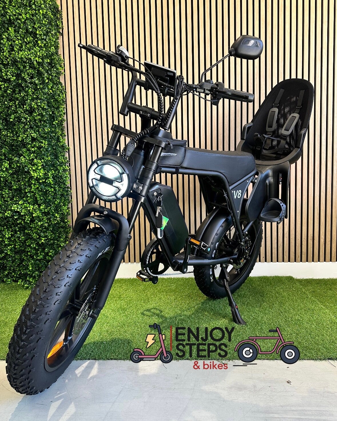 De Ouxi V8 is het zeer bekende fatbike model in de Ouxi familie! Deze unieke Ouxi e-bike heeft veel weg van de gewilde en stoere motorfietsen. In het jasje van zo'n motorframe samen met een set 20 inch dikke offroad banden, een grote accu en behoorlijk veel opties is deze Ouxi V8 fatbike een elektrische fiets van hoge kwaliteit en performance. Zand, sneeuw, gras en asfalt is allemaal geen probleem voor deze e-bike welke nu met gratis vele extra accessoires komt! De Ouxi V8 fatbike heeft nu handige, vele functies. Tijdelijk komt deze namelijk met een gratis Live GPS Tracker, alarm met afstandsbediening, achterzitje, voorrekje en een handige telefoonhouder!